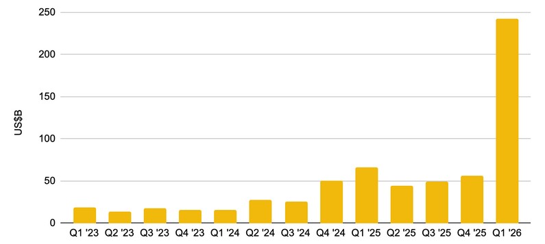 Rajah 2: AI memperoleh kira-kira US$242B, atau 80%, daripada pembiayaan usaha niaga global pada Suku Pertama 2026