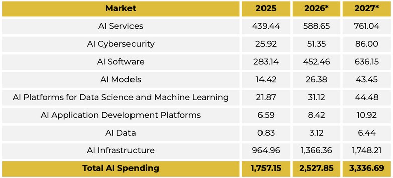 Skala aliran modal ke dalam AI tidak pernah berlaku sebelum ini. Gartner menjangkakan perbelanjaan AI di seluruh dunia akan meningkat daripada US$1.76T pada tahun 2025 kepada US$2.52T pada tahun 2026, sebelum mencecah US$3.34T pada tahun 2027, dengan infrastruktur AI menyumbang kepada bahagian terbesar daripada jumlah perbelanjaan.