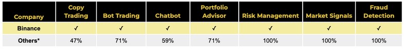 Walau bagaimanapun, liputan AI merentasi platform perdagangan utama kekal tidak sekata. Fungsi seperti pengurusan risiko, isyarat pasaran dan pengesanan penipuan adalah universal, tetapi alat yang menghadap pengguna (salinan perdagangan, chatbot, penasihat portfolio) hanya digunakan oleh 47-71% daripada 17 platform lain yang ditinjau, menonjolkan di mana pembezaan masih wujud pada lapisan produk.