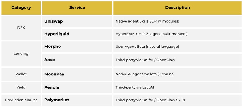 • DeFi: Pelaksanaan berkaitan ejen kini beroperasi merentasi pelbagai protokol utama, dengan corak terbahagi kepada dua pendekatan: SDK ejen natif protokol dan lapisan agregator pihak ketiga yang menghalakan aktiviti ejen merentasi banyak protokol sekaligus. Pengeluaran tujuh Kemahiran sumber terbuka Uniswap pada bulan Februari merupakan langkah penting, menandakan salah satu kit alat natif protokol pertama yang dibina khas untuk ejen autonomi pada DEX terbesar.