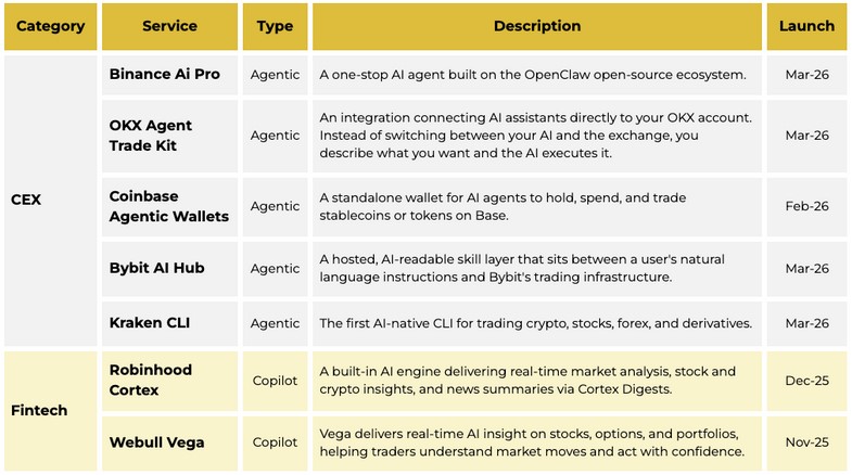 Dalam dimensi khusus pelaksanaan autonomi yang menghadap pengguna, platform kripto bergerak lebih pantas daripada platform TradFi dalam produk yang dilancarkan secara terbuka. Pelancaran AI TradFi, baik retail seperti Robinhood Cortex, Webull Vega mahupun institusi seperti JPMorgan IndexGPT, Morgan Stanley AI Assistant, sebahagian besarnya kekal dalam wilayah co-pilot, tertumpu pada penyelidikan, nasihat dan produktiviti. Ini mencerminkan pengawasan kawal selia yang lebih ketat dan hakikat bahawa pelaksanaan TradFi masih berjalan melalui sistem legasi dan perantaraan. Sebaliknya, beberapa pertukaran kripto melancarkan alat pada Suku Pertama 2026 yang melangkaui output nasihat dan lebih dekat dengan pelaksanaan, sama ada melalui automasi strategi, wallet yang berkaitan dengan ejen atau toolkit terbuka untuk ejen perdagangan (trading agents).