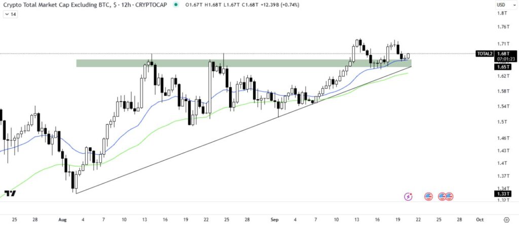 Gambar 3. Altcoin Market Cap: breakout dari ascending triangle, 21/50MA sebagai sokongan dinamik. Pegangan atas paras ini = pro-altseason.