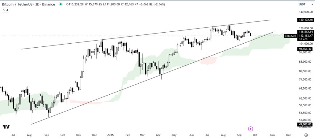 Gambar 2. BTC/USDT: di dalam rising wedge, disokong Ichimoku cloud. Lantun di atas kumo = peluang ke $120–$123K, tapi jika pecah lantai = risiko $108–$110K.