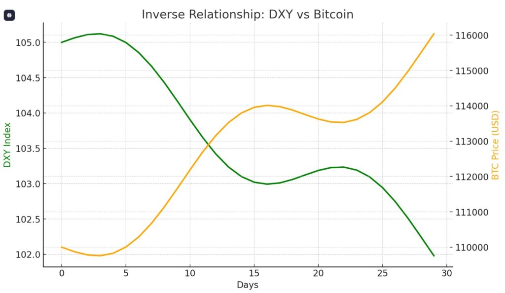 Gambar 1. DXY vs BTC: bila USD melemah (garis hijau turun), Bitcoin cenderung dapat ruang bernafas dan rally.